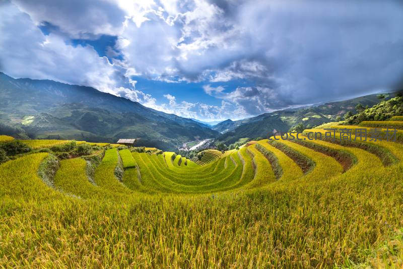 成熟季的梯田泛着金色波浪,环抱于青翠群山之间,蓝天白云下尽显丰收的喜悦与大自然的磅礴气势。