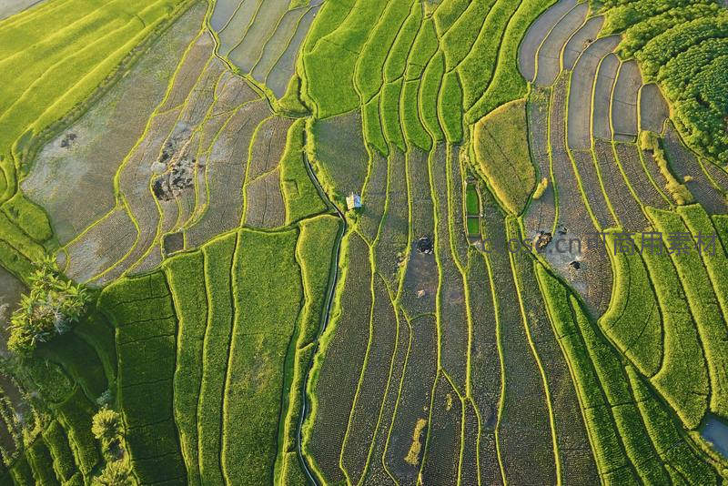 高空视角捕捉梯田丰富色彩与纹理,绿黄交错、水光潋滟,构成一幅大地抽象艺术作品。