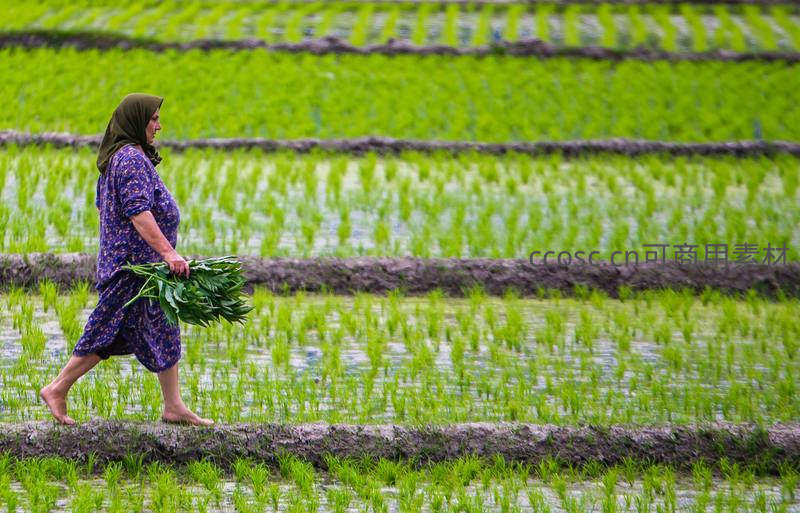 一位身着民族服饰的妇女赤足走在田埂上,手中捧着一捆鲜嫩的秧苗,背景是无垠的碧绿水田,充满生活气息。