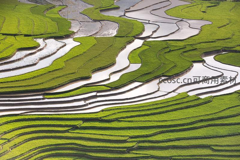 近距离捕捉梯田的优美曲线,灌满水的田块如镜面般反射天空,与翠绿的稻苗交织成流动的自然艺术。