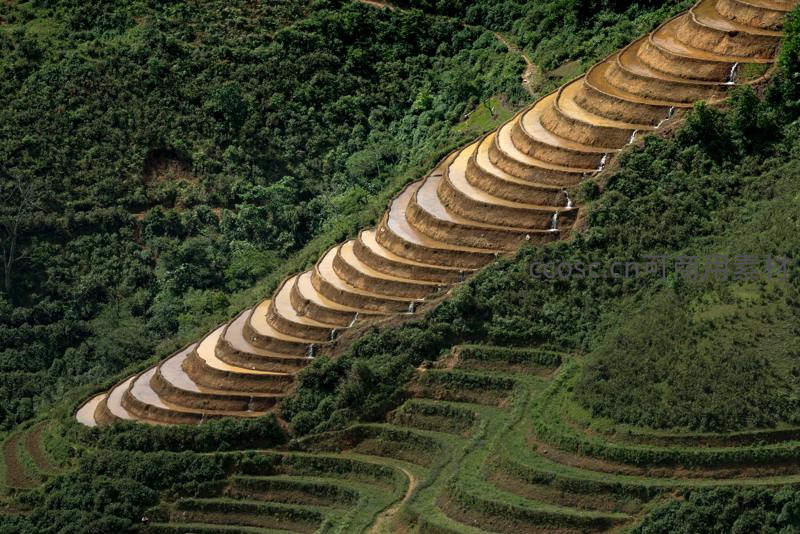 层层叠叠的梯田沿着山势蜿蜒而上,水面倒映天空,与葱郁森林相接,展现人与自然和谐共生的壮丽景观。