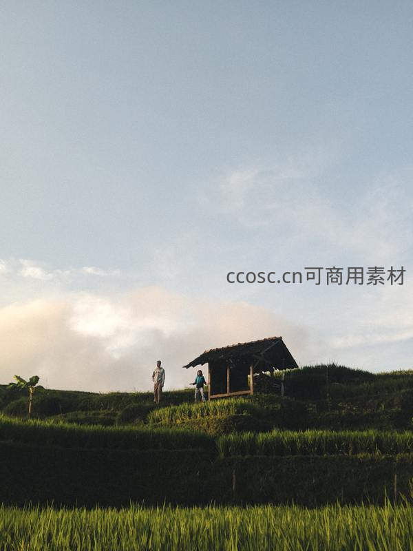 在层叠的翠绿梯田之上,一座木制小亭静立,两位旅人驻足远眺,享受着黄昏时分的宁静与壮阔。