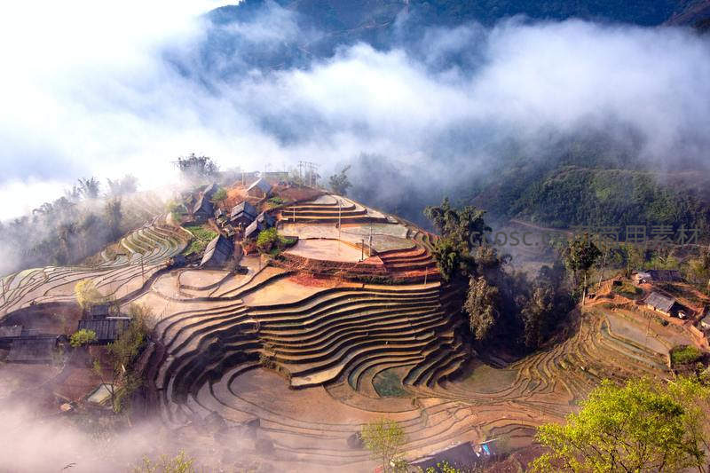 从高空俯瞰,层层叠叠的梯田如大地的指纹,被流动的云海温柔环抱,山间村落若隐若现,宛如人间仙境。