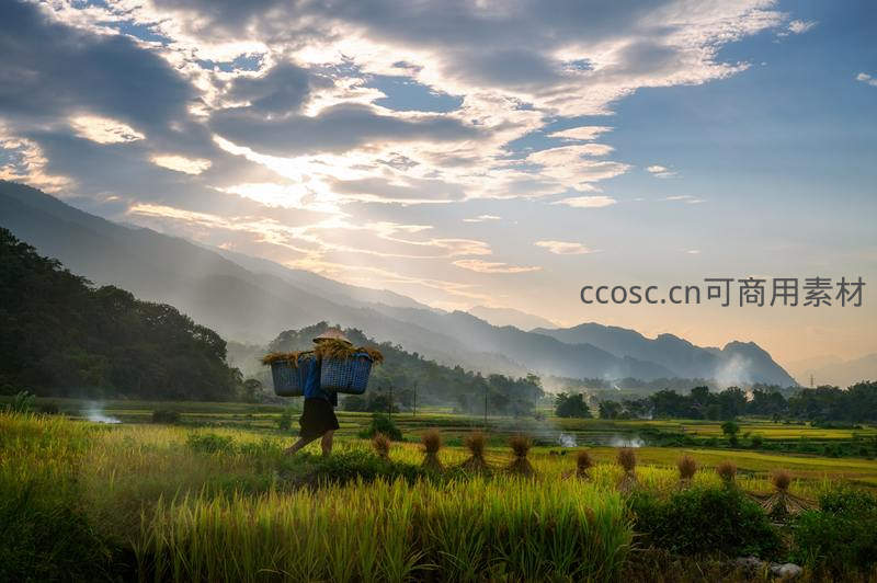 一位农夫背着沉甸甸的稻谷,在晨光穿透云层的山野间行走,身后是刚收割完毕的田野和连绵起伏的青翠山峦。