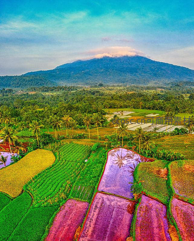 经过艺术化处理的梯田呈现出梦幻般的紫粉色,倒映着蓝天白云和远山,宛如置身于一个超现实的童话仙境。