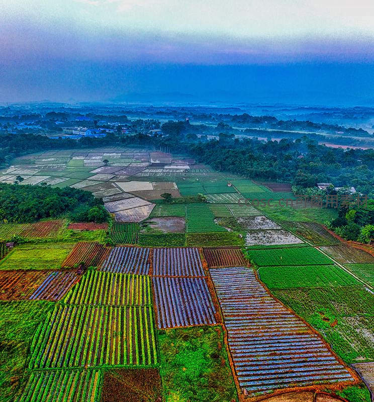 从高空鸟瞰,广袤的田野如同一块巨大的调色板,不同颜色和形状的农田拼接成精美的几何图案,远处村庄隐现于薄雾之中。