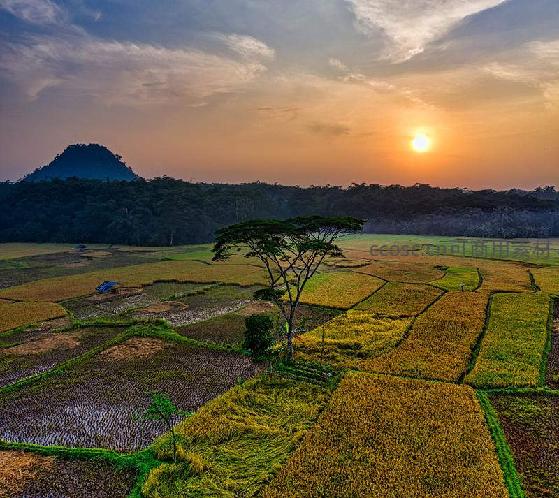 从高空俯瞰,夕阳将金辉洒在色彩斑斓的梯田上,一棵孤树伫立其间,远处山丘与彩霞相映,构成壮丽的大地画卷。