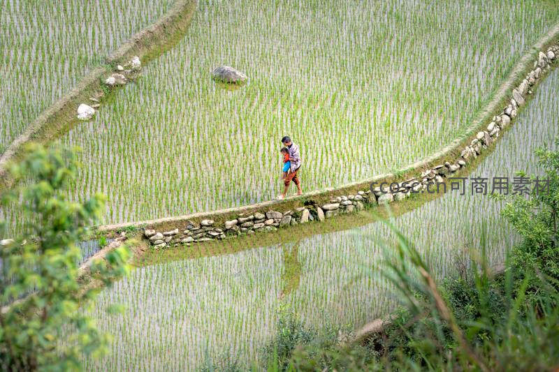 一位农人沿着用石头垒成的小径走过碧绿的水田,水面倒映着他的身影和周围的绿意,整个场景宁静而富有生活气息。
