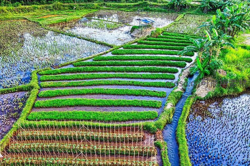 层层叠叠的绿色梯田如镜面般倒映天空,展现人与自然和谐共生的农耕画卷。