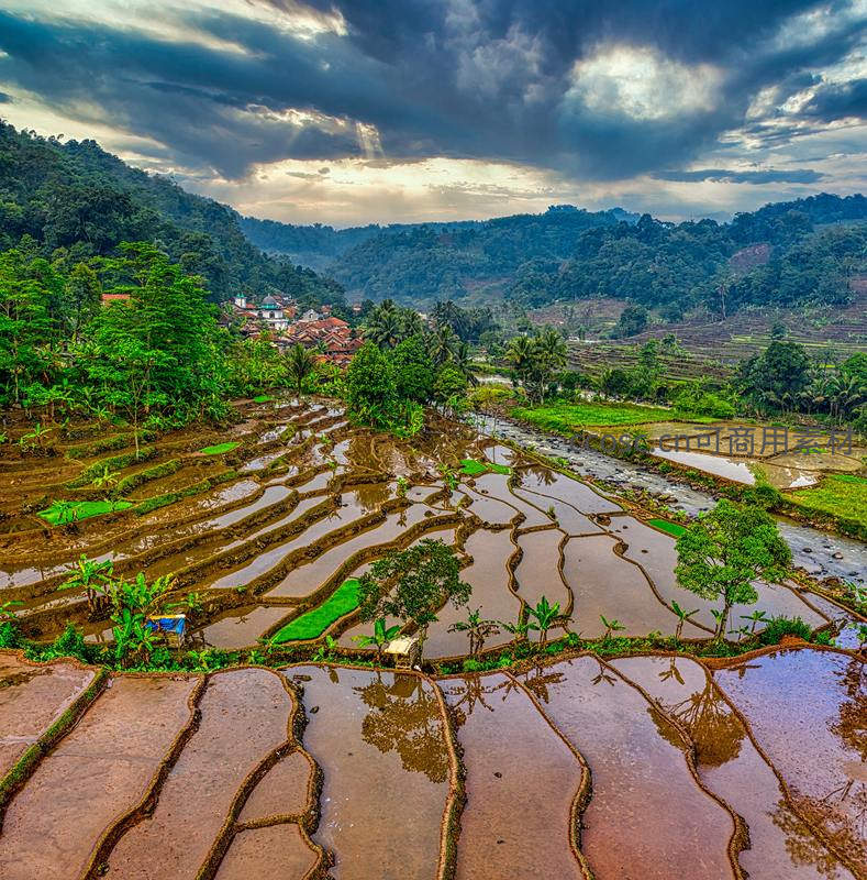 厚重云层下,水满梯田如镜面般倒映天光山色,构成一幅充满戏剧张力的自然画卷。