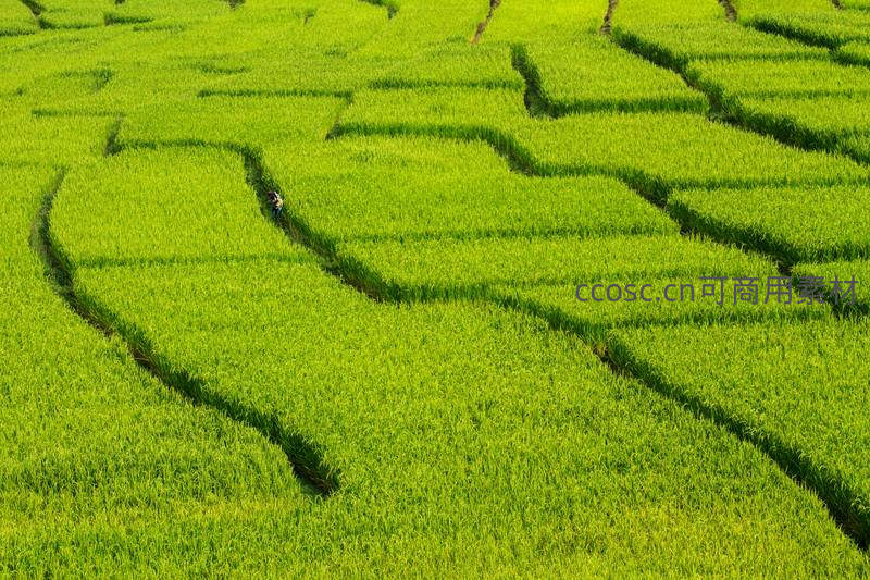 从高空俯瞰,层层叠叠的翠绿梯田如大地的指纹,一位农人在田埂间穿行,展现人与自然和谐共生的田园画卷。