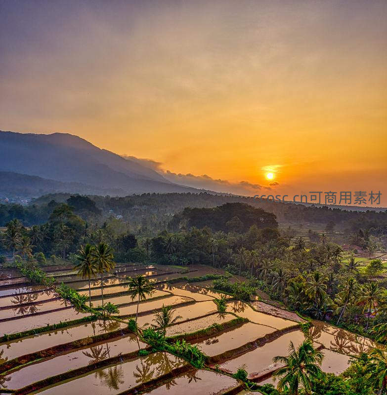 夕阳西下,金色余晖洒满水田,棕榈树倒影清晰如画,远山朦胧,营造出温暖静谧、诗意盎然的黄昏美景。