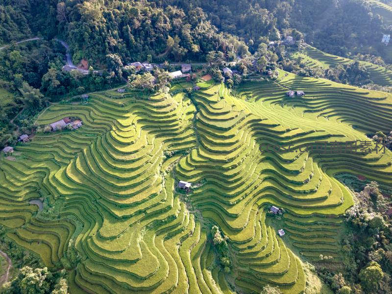 阳光倾泻在起伏如波浪的梯田之上,明暗交错间凸显大地纹理,散落村舍点缀其间,尽显自然与人文的和谐之美。