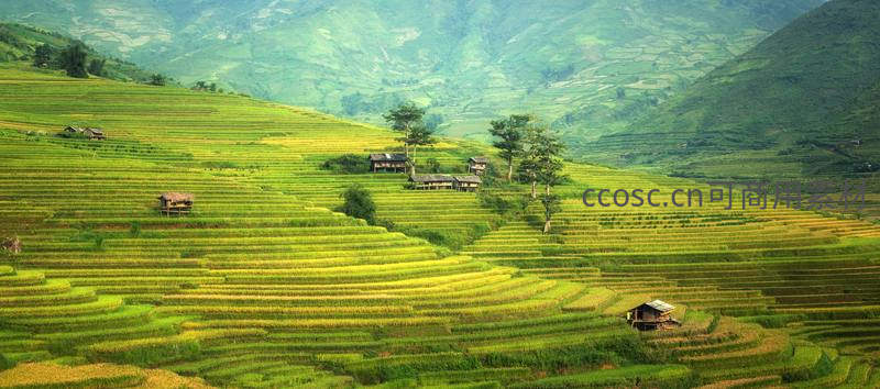 山谷中的金色稻浪与村舍