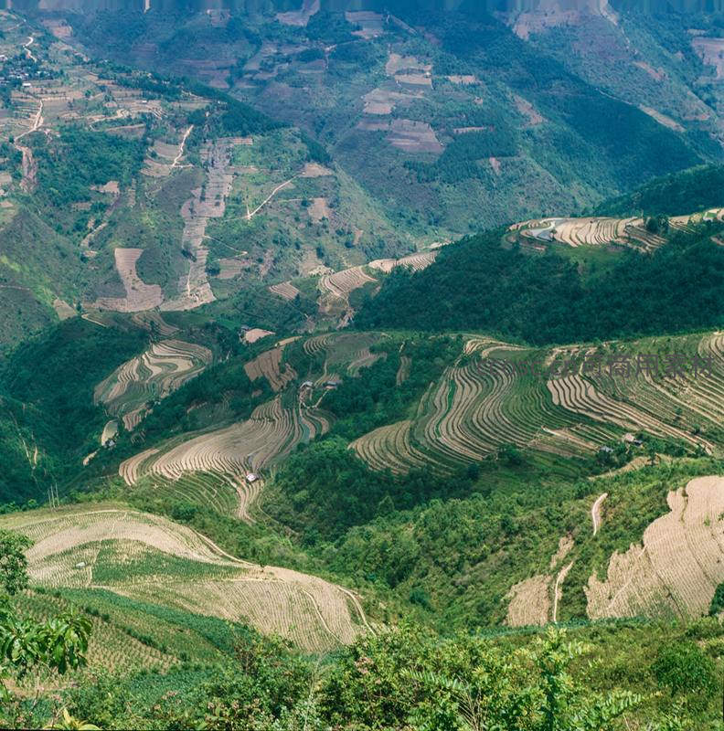 从高空俯瞰,梯田如大地的年轮般在起伏的山峦间蜿蜒铺展,展现出人类改造自然的智慧与力量。
