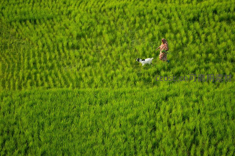 一位母亲牵着女儿和一只白色小狗,在无垠的翠绿稻田中漫步,画面温馨宁静,充满田园生活的幸福感。