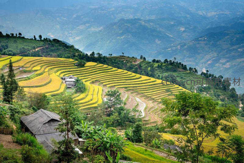 层层叠叠的金色稻田沿着山坡蜿蜒铺展,几座传统农舍散落其间,远处青山云雾缭绕,构成一幅宁静壮丽的田园画卷。