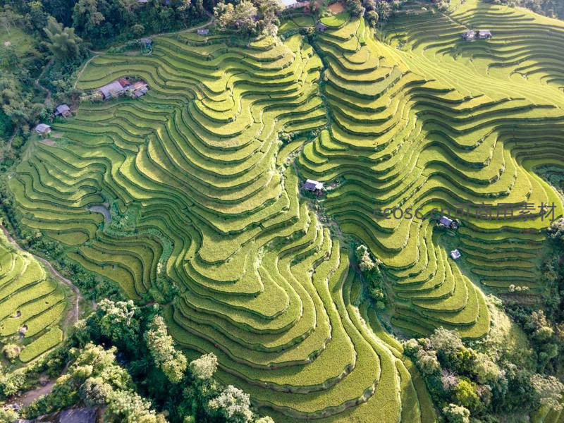 俯瞰翠绿梯田如大地艺术波浪起伏