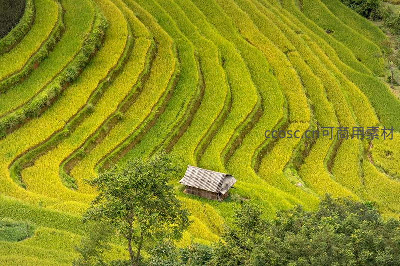 层层叠叠的金色梯田如波浪般延展,一座小木屋静静伫立其中,四周绿树环绕,尽显田园诗意与丰收喜悦。