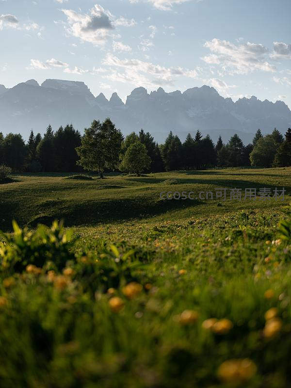 远处连绵的山峰在薄雾中若隐若现,近处是沐浴在阳光下的葱郁草地与点点野花,充满生机与宁静。