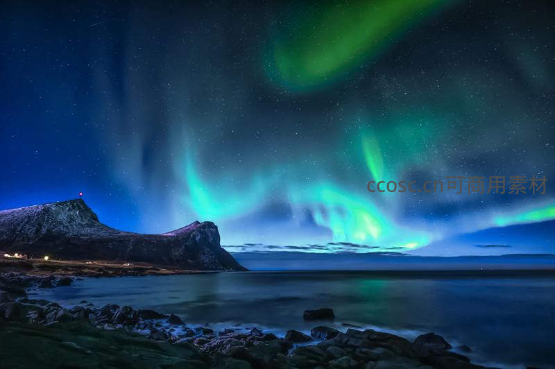 绚丽的绿色极光在深邃的夜空中如丝带般舞动,下方是平静的海面和嶙峋的岩石海岸,营造出梦幻般的宁静氛围。