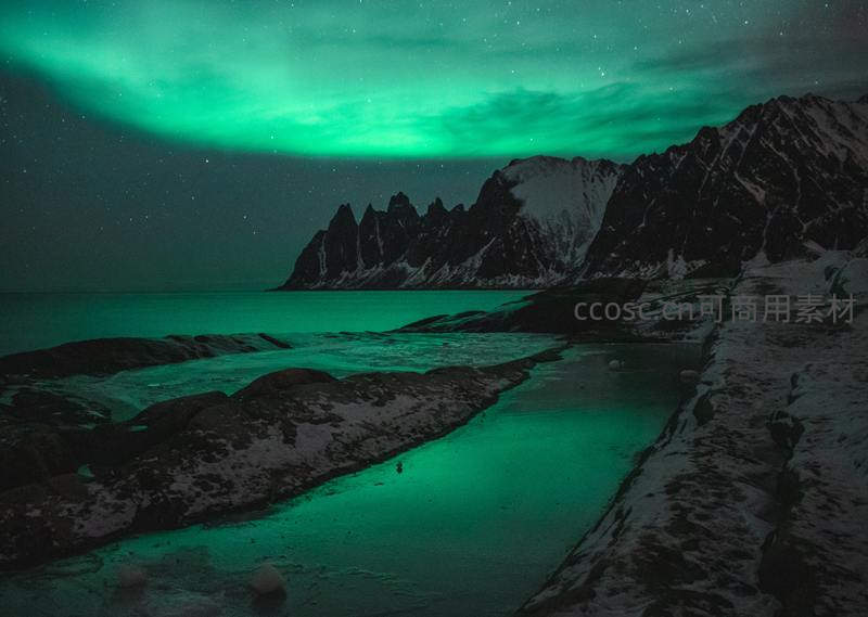 幽绿极光笼罩着嶙峋的海岸山脉,海面倒映着天空的奇幻色彩,雪地与礁石在光影中勾勒出冷峻而迷人的北国夜色。