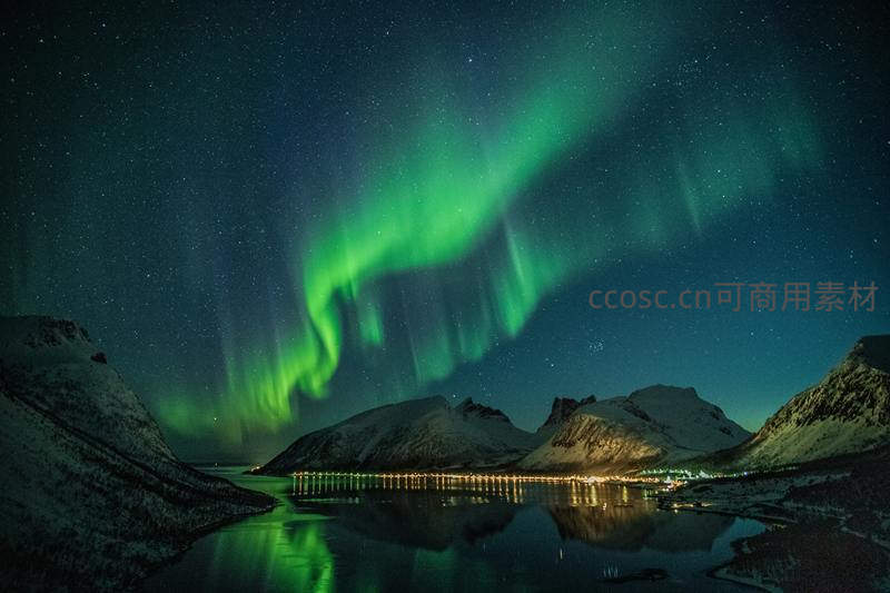 翠绿极光横贯星空,其光芒与山峦、湖水及小镇灯火共同在镜面湖中形成完美倒影,营造出宁静而充满魔幻色彩的北欧之夜。