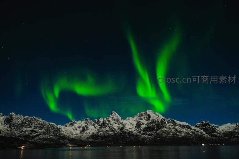 璀璨的绿色极光在深邃夜空中如精灵般舞动,下方是连绵的雪山和宁静的海湾,远处村落的灯火为这幅壮丽画卷增添了温暖的人间气息。