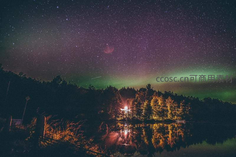 极光下的湖畔森林夜景