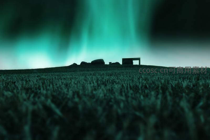 从贴近地面的视角仰望,碧绿极光如帷幕般笼罩大地,前景草叶清晰可见,营造出天地交融的梦幻氛围。