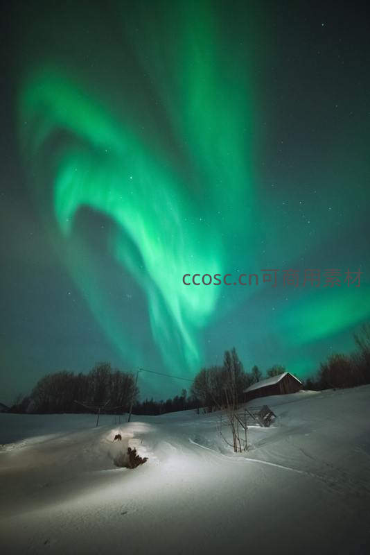 被厚厚积雪覆盖的乡间小屋,在绚烂绿色极光的映衬下宛如童话世界,宁静温馨,令人向往。