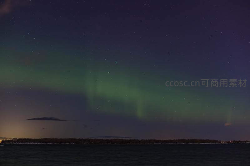 平静的海面上方,一道柔和的绿色极光横跨天际,远处海岸线隐约可见,整个画面充满宁静、辽阔与宇宙的神秘感。