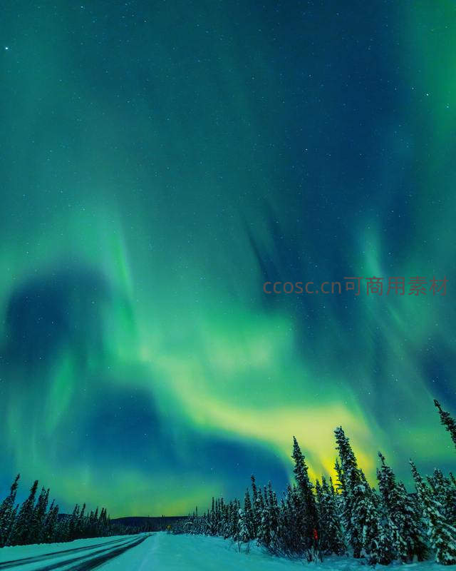 一条雪路延伸至远方,两旁是覆雪的针叶林,头顶是翻涌的绿色极光与满天繁星,展现北国冬夜的辽阔与静谧。