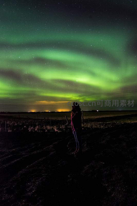 在无垠的黑暗旷野中,一个孤独的身影静静伫立,抬头凝望满天流动的绿色极光,感受着宇宙的浩瀚与内心的宁静。