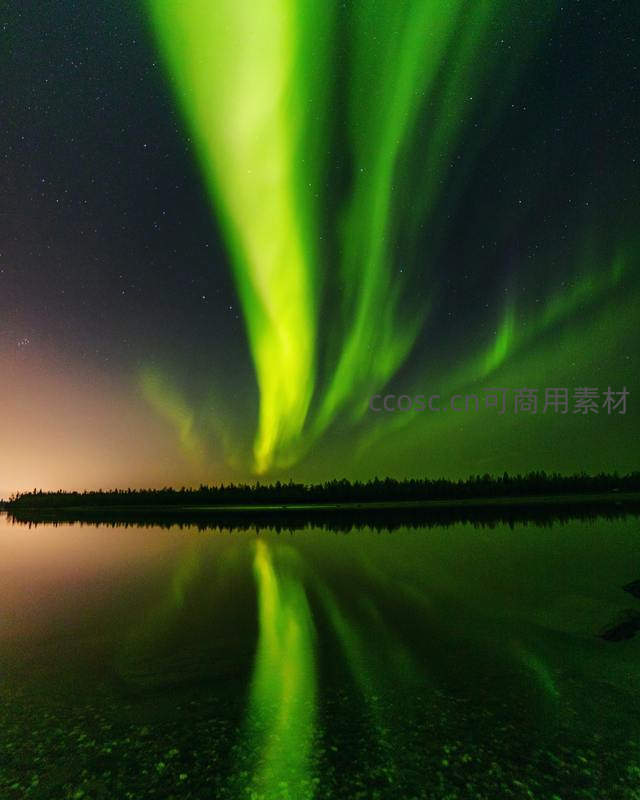 绿光舞动夜空,湖面倒影如梦似幻