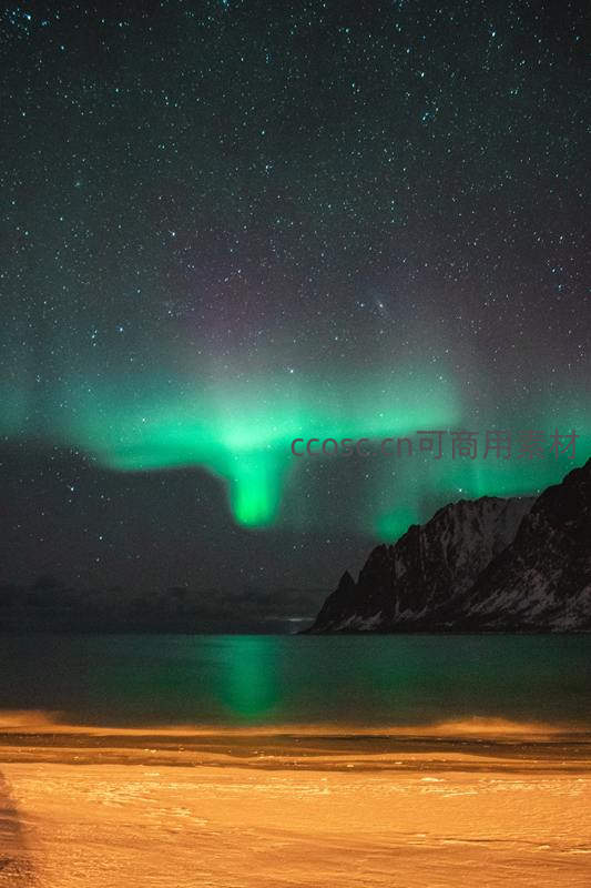 在浩瀚星河的注视下,绿色极光温柔地洒落在积雪覆盖的海岸线上,为这片寒冷之地披上了一层梦幻的绿纱。
