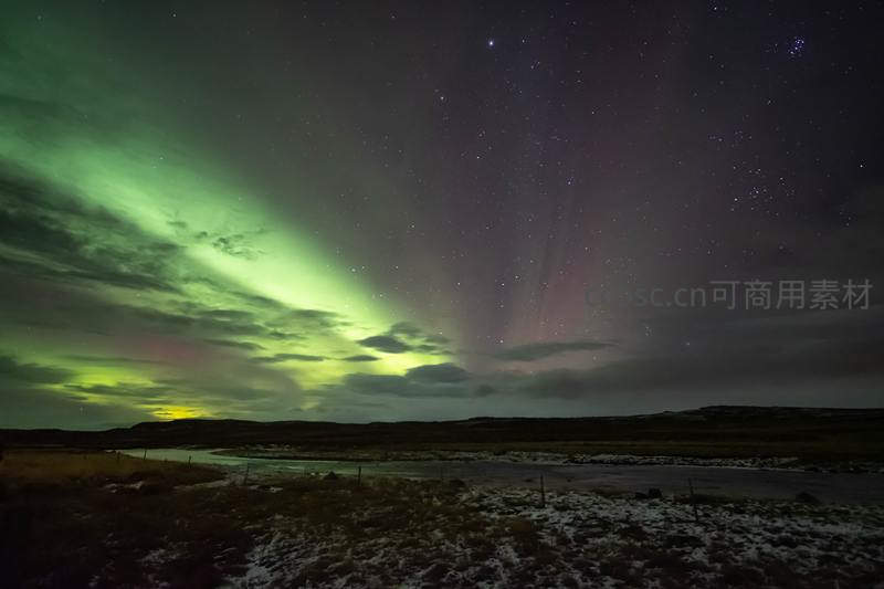 在飘渺云层的缝隙间,绿色与紫色的极光与银河交相辉映,共同在广袤的夜空中演绎一场震撼人心的光影之舞。