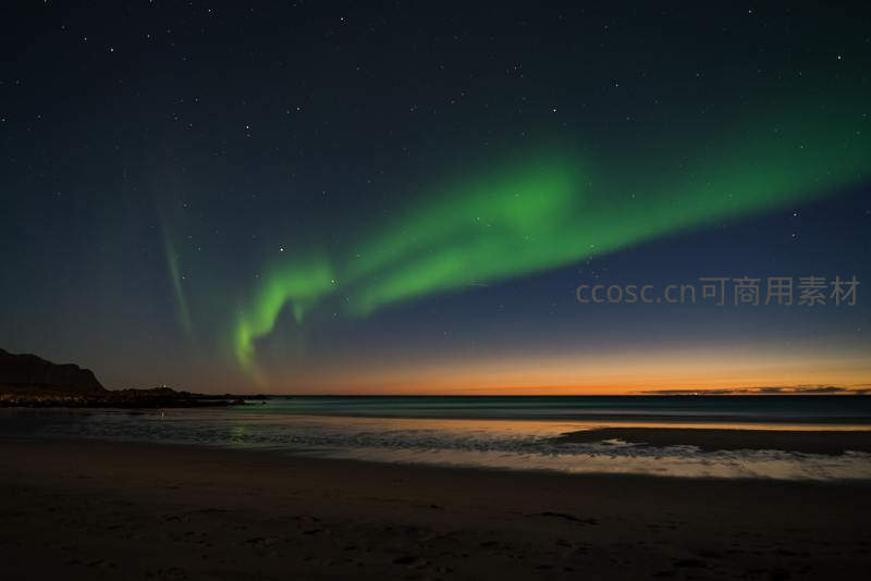 深邃夜空中,翠绿的极光如绸缎般飘逸,与满天繁星及地平线处的橙色晚霞交相辉映,海浪轻拍沙滩,静谧而壮丽。