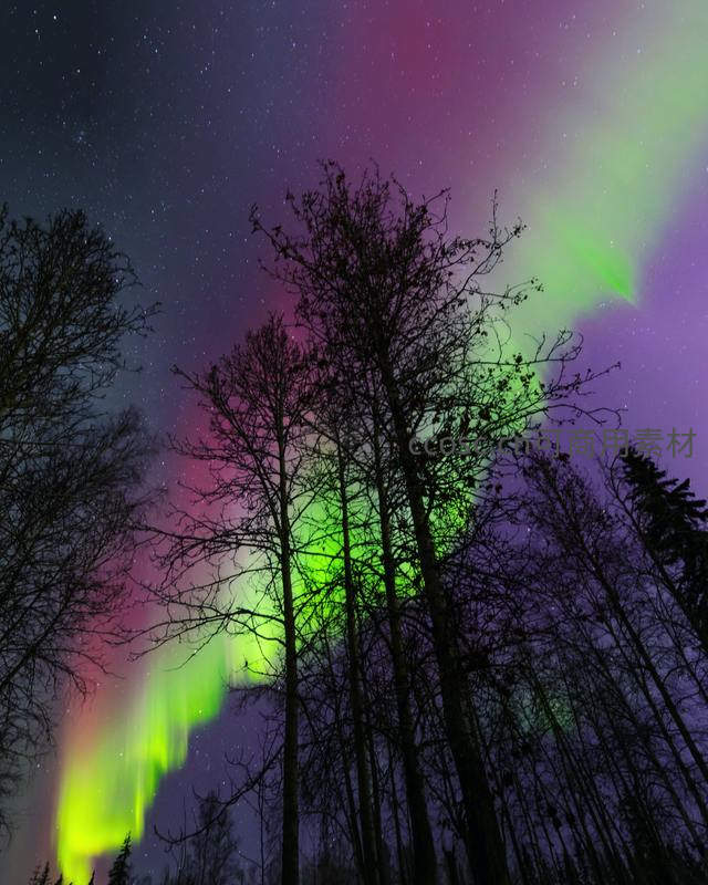 从林间仰望,枝桠交错的树影勾勒出天空的轮廓,绚烂的紫绿极光如魔法般倾泻而下,将寂静的森林染上梦幻色彩。
