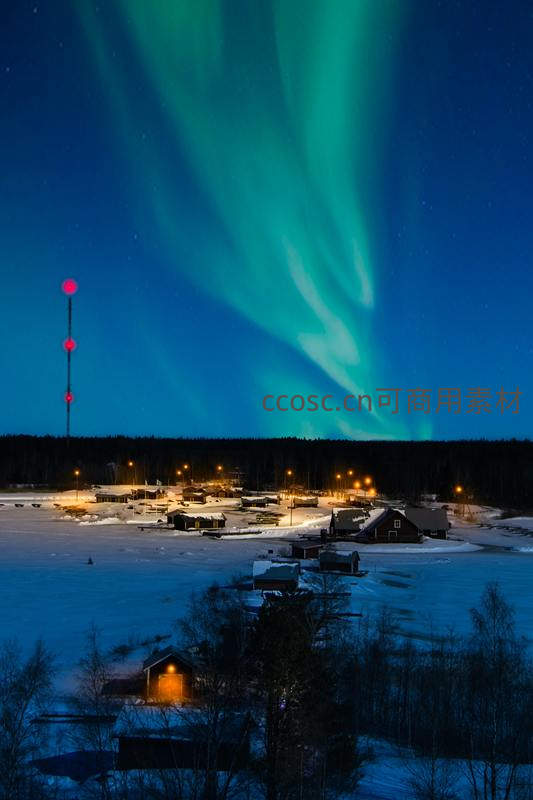 在白雪覆盖的村庄上空,绿色极光如飘逸的绸缎舞动,与温暖的灯火和高耸的通信塔形成冷暖对比,展现北欧冬夜的独特魅力。