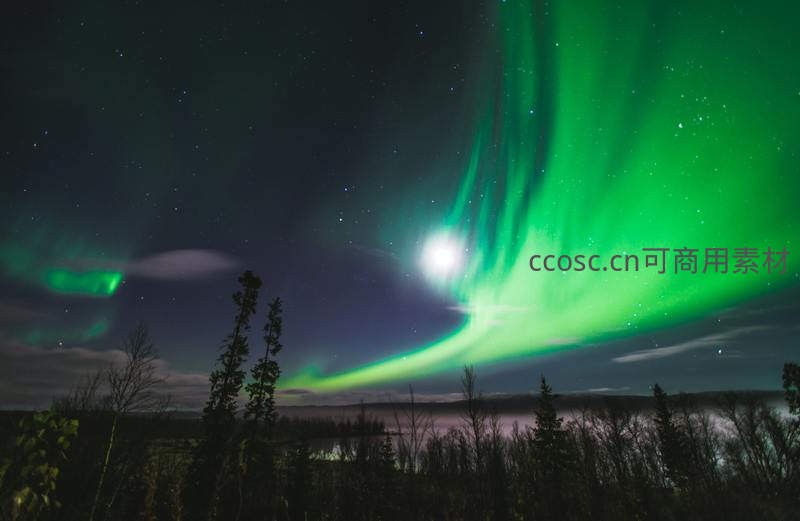 深色的森林剪影作为前景,衬托出天空中绚烂夺目的绿色极光,远处湖泊倒映微光,营造出神秘而宁静的自然奇观。