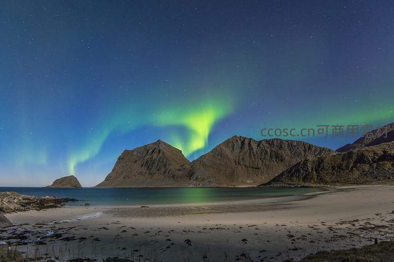 柔和的绿色极光映照在平静的海湾水面上,与雄伟的山峦和细腻的沙滩相得益彰,构成一幅宁静而壮丽的北欧自然风光图。