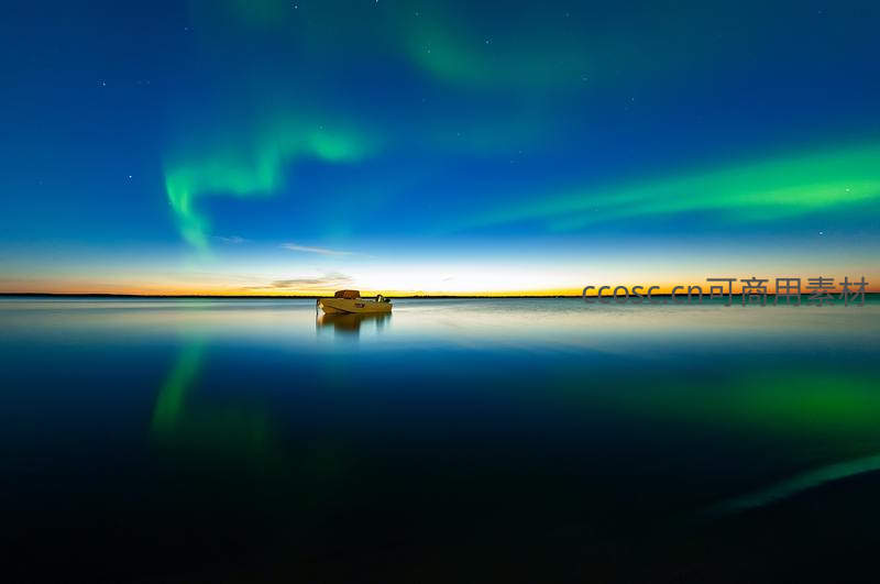 一艘小船静泊于平静湖面,头顶是绚烂的极光与晚霞交融,倒影如画,意境悠远。