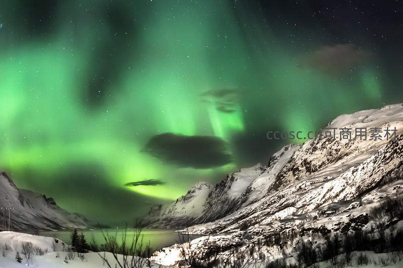 璀璨的绿色极光如丝带般飘舞在雪山与湖泊上空,星河点缀夜幕,营造出梦幻而宁静的北欧冬夜奇景。