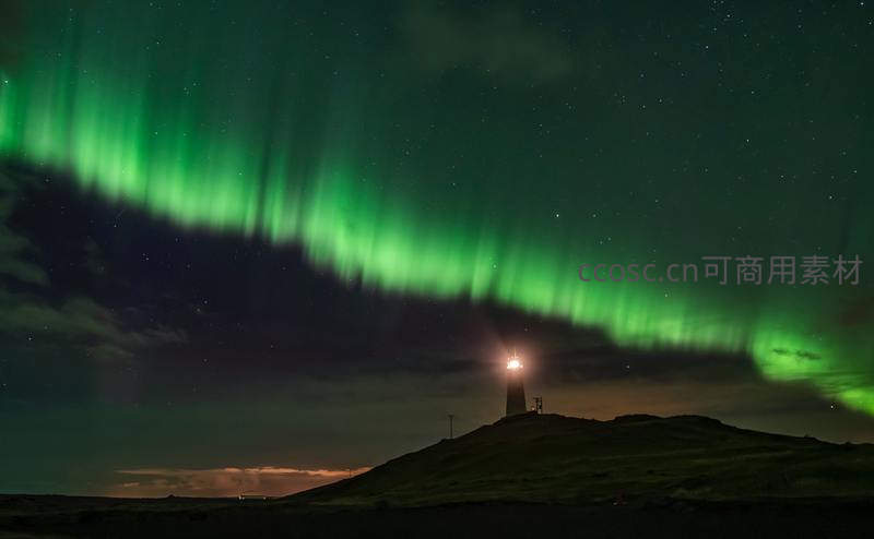 灯塔守望极光天幕,绿辉洒满寂静山丘