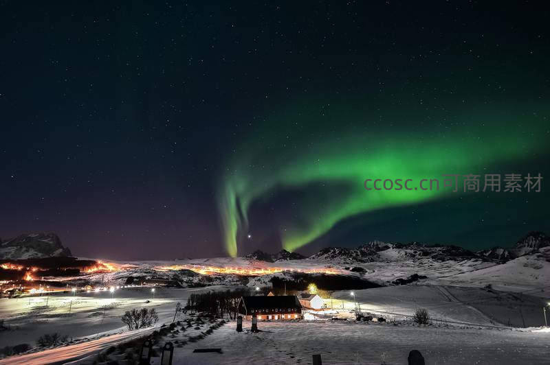 璀璨的绿色极光如巨大的帷幕笼罩着被白雪覆盖的小镇,温暖的灯火与冷冽的星光交相辉映,展现了人与自然和谐共存的冬日奇景。