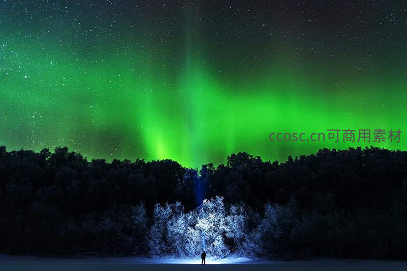 一人伫立雪原,仰望漫天舞动的绿色极光,繁星点缀苍穹,天地间尽显自然奇迹与宇宙浩瀚。