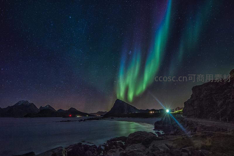绚丽的极光从星河垂落至海岸线,与远处山峦和近处礁石相映成趣,海面倒影与灯光交织,构成一幅壮丽的自然画卷。
