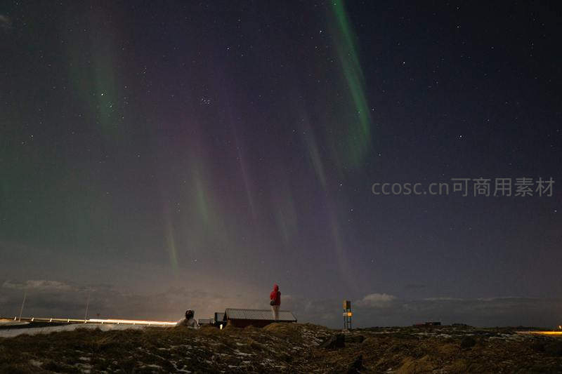 几位游客驻足荒野,在璀璨星空与飘洒的紫绿色极光雨下静静仰望,感受大自然的震撼与内心的平和安宁。