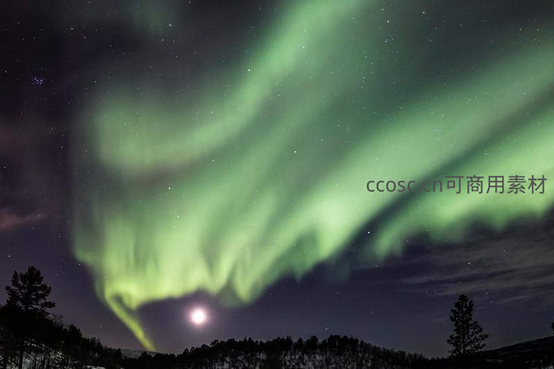 璀璨的绿色极光在深邃夜空中如丝带般飘舞,与繁星、明月和雪地森林交相辉映,营造出梦幻而宁静的自然奇观。